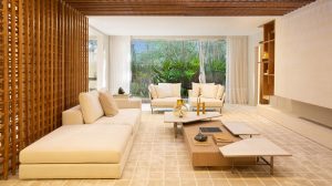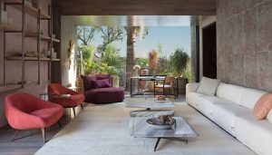 No mobiliário, a arquiteta utilizou tecidos com texturas confortáveis e toque macio para os estofados. Na chaise long Kamari, o linho saint barth ameixa se destaca e faz composição com o sofá em linho Leblon Ivory. Já as poltronas Mayu ganharam revestimento de camurça dark cherry para trazer um tom vibrante. Outro destaque é a composições de mesas Lamai em mármore Salak, que também aparece no aparador Manui. O material traz a energia da pedra natural e dialoga com o revestimento em pedra na parede e os tons terrosos e rosados do ambiente.