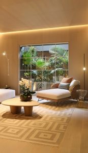 Para Jorge Elmor, o “morar bem” está em um ambiente amplo, claro e fluido, onde é possível sentir paz e relaxamento. Para isso, o arquiteto usou tons pastéis, suaves e neutros, pontuados com toques leves de cor. A composição do mobiliário foi feita para acolher com conforto, beleza e leveza, seja na textura dos materiais, ou na luz que vem do teto, por meio de uma grande instalação luminosa que invade o ambiente. “Nos despimos dos excessos para nos reconectar com o que nos faz bem e reforça nossa essência. A atmosfera plácida e acolhedora coloca o usuário como protagonista e oferece todo o conforto para realizar as atividades cotidianas”, conta o arquiteto. Ele ainda destaca a bancada em granilite, e as obras de arte da galeria Sérgio Gonçalves como complemento de todo o conceito.