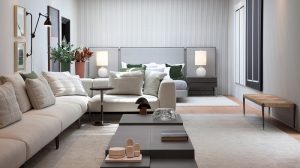 O living para reunir família e amigos de Margit Soares é um convite a diversão. Funcional, confortável e neutro, o espaço tem muitos lugares graças aos módulos e puffs Maddox. Para oferecer apoio, a profissional lançou mão das mesas de centro Lena – lançamento da nova coleção, acabamento louro radiance – compostas com as mesas de centro Oro dando movimento e sofisticação ao projeto.