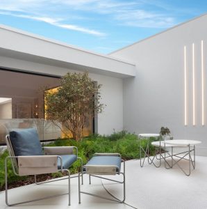 O arquiteto Ivan Wodzinsky apresenta um projeto de arquitetura e paisagismo principal da loja, criando uma grande varanda aberta. Um espaço luxuoso, sóbrio e atemporal, que se conecta a cidade e o seu charmoso urbanismo. A varanda coberta, mas não fechada, é repleta de texturas, com a predominância da madeira, brilhos e reflexos das peças e o verde que circunda toda a área. São quase 100m2, em um espaço que forma ligação visual com o público passante em frente à loja, levando a marca para mais perto das pessoas. Do lado oposto ao terraço, Ivan criou um jardim para a loja, composto de diferentes espécies de vegetações. No mobiliário, peças da linha Beach & Country criam uma atmosfera de contemplação, conforto e beleza com módulos estofados Kondey – onde é possível sentar de qualquer lado – e as confortáveis poltronas Kalasi, completam o grande lounge.