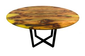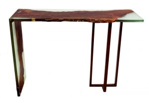 O brilho também impressiona e móveis com esse acabamento resinado têm valor agregado e estético. O desenho orgânico da madeira injetado na resina e a mistura de materiais atemporais como os metais criam infinitas possibilidades de composição e produção de peças robustas e ao mesmo tempo clean e cheias de bossa.