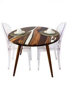 Essa combinação proporciona um efeito singular, a transparência da resina deixa a mostra toda beleza da madeira e a vantagem de se ter um móvel com essas características é a manutenção e a facilidade da limpeza, já que a madeira não apodrece nem estraga, ficando blindada de pragas, insetos e poeira.