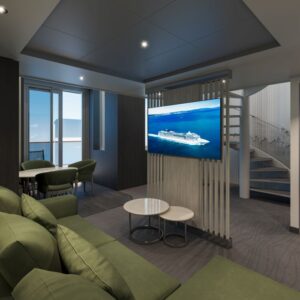 O novo navio fará a estreia da nova Royal Duplex Suite, que oferece 53 m² distribuídos em dois andares, com dois quartos independentes e varanda privativa de 11 m² com hidromassagem. Capaz de acomodar até seis hóspedes, esta suíte foi projetada especialmente para famílias ou grupos, com uma ampla sala de estar ideal para entretenimento.