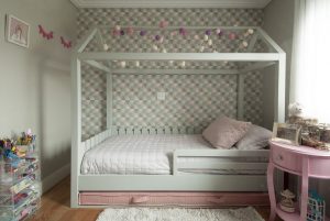 Uma forma prática de atrair os olhares para as paredes é revesti-las com papel. “O mercado conta com uma versatilidade enorme de papeis de parede, dos mais neutros aos mais ousados, para todo estilo de projeto”, opinam Bianca Tedesco e Viviane Sakumoto, que para o projeto desse quarto super romântico, optaram por um modelo geométrico, com um delicado tom de rosa que conversa com a cabeceira.