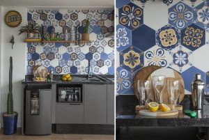 Trazer cor e leveza para a varanda gourmet foi um dos desejos de Bianca Tedesco e Viviane Sakumoto para o projeto desse apartamento, em São Paulo. Além de harmonizar com a paleta de cores de todo o estar, os ladrilhos hidráulicos (Baepi) foram a escolha para criar um cantinho de destaque, conferindo uma estética retrô para o ambiente. Eles atraem o olhar para a área da bancada, que foi toda equipada com churrasqueira, cervejeira e adega. “Para harmonizar, as outras paredes são neutras, com tons de branco e cimento queimado”, apontam as profissionais.
