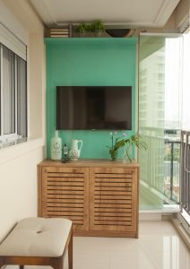 Por fim, impossível falar de paredes sem pensar nas cores. Para conferir destaque para o cantinho da televisão nessa varanda gourmet, as profissionais da Tesak Arquitetura optaram por um tom de verde acqua, que se complementa perfeitamente com o móvel de madeira. “O verde é uma escolha que aproxima a natureza dos interiores, conferindo sensação de bem-estar e aconchego”, explicam.
