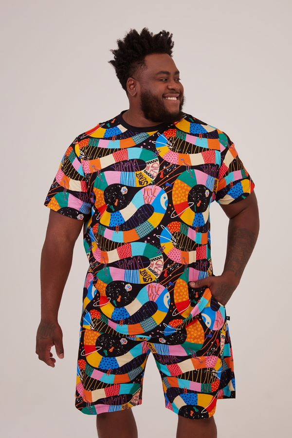 Para os homens, a Camiseta Jogo de Tabuleiro tem modelagem clássica, com gola careca e detalhe em ribana na cor preta, contrastando com a estampa e proporcionando ainda mais charme à peça de manga curta e barra reta.