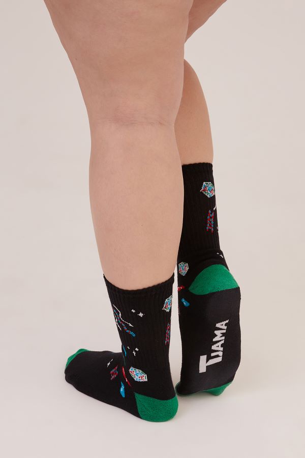 O par de meias, produto inédito na TJama, recebe modelagem cano alto e estampa com elementos que combinam perfeitamente com os conjuntos da coleção. (R$39,90)