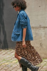Os destaques ficam para as propostas de camisa, saia longa e blusa em xadrez jacquard; para a estampa animal print, presente em uma saia longa, vestido e blusas de diferentes comprimentos; para a jaqueta, minissaia e vestido em tweed com jeans; e para a jaqueta, saias e calças em jeans texturizado. A combinação do azul e do marrom também ganhou protagonismo no lançamento.