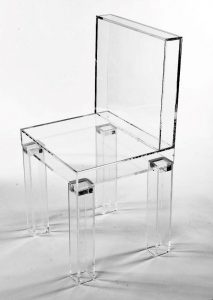 A cadeira Gogoya acrescenta personalidade e se integra a qualquer ambiente. Por meio das linhas geométricas de forte sofisticação do acrílico espesso, a peça provoca o impacto ideal entre humor e elegância. A partir de aberturas pivotantes, a cadeira se revela completamente customizável, de forma que atue como uma plataforma expositiva de itens que podem ‘rechear’ livremente seu interior.