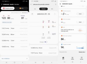 4O histórico da pressão arterial medida pode ser visualizado no aplicativo Samsung Health Monitor em um smartphone pareado.