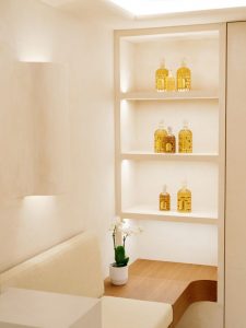 O spa foi projetado para criar uma sensação de bem-estar, tanto pelos tratamentos quanto pelos espaços onde são administrados. Desde o momento em que se entra, as proporções cuidadosas, a escolha de tecidos leves e de cores suaves e o conforto do mobiliário ergonômico estimulam todos os sentidos. A natureza está presente em toda parte e inspirou as escolhas da arquiteta: “Usei madeira clara, adicionando toques de latão e elementos de ráfia. As salas de tratamento têm pigmentos naturais que lembram a areia, mesclando interior e exterior. A iluminação invisível remete aos raios do sol.”
