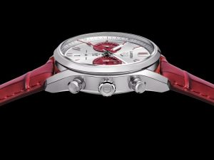 Uma pulseira de couro de crocodilo em um elegante vermelho complementa as caixas em aço e ouro rosa 18K 5N, realçando o fascínio sofisticado e de corrida do relógio.