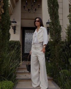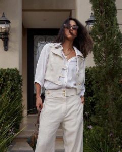 Eles voltaram! Protagonistas da edição, o colete ganhou a graça dos estilistas. Agora, são apresentados com diferentes modelos e composições. Uma proposta assertiva e elegante é o de linho em tom neutro. Aplicações de botões dourados dão o toque final. Este modelo é ideal para combinar com itens mais sofisticados ou, até mesmo, para finalizar looks mais despojados.