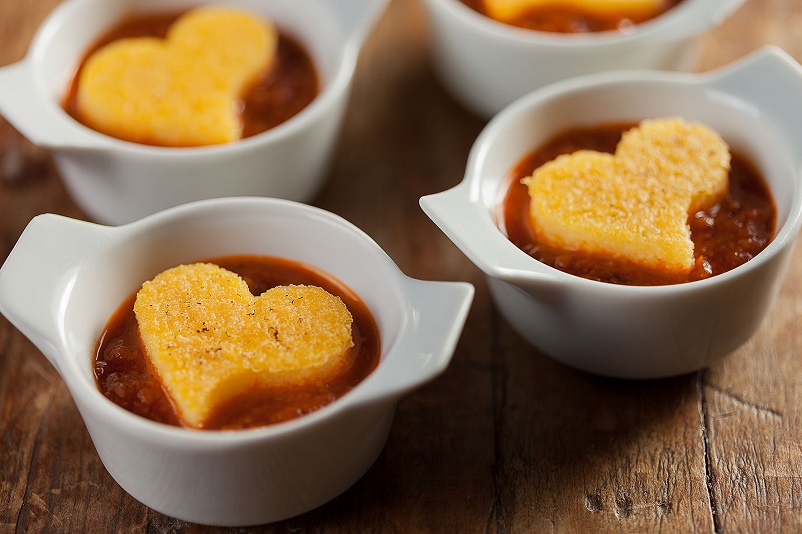 Polentinha vegana em formato de coração: feita com manteiga ghee pela chef Raphaela Homem de Melo.