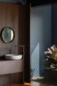 A sobriedade que conduz a paleta do espaço ganha exclusividade e linhas assinadas em metais e acessórios Deca na cor Black Matte e o contraponto com louças e a banheira branca. Em bancadas individuais as Cubas de apoio Gota trazem um desenho orgânico que incentiva a calmaria, com maior conexão com elementos naturais pela ideia de fluidez da água. O design externo clean reproduz, em seu interior, o efeito visual da água ao ser tocada em sua superfície estática por uma gota. Para compor, misturadores de piso para lavatório da linha Arthur Casas reforçam a estética contemporânea do espaço.