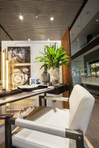 Uma grande placa de porcelanato marmorizado foi instalada na parede, fazendo um contraste interessante com os quadros em destaque. “Mesclamos elementos modernos e clássicos, para trazer mais sofisticação ao office”, afirma Gerson.