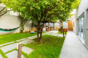 As largas portas de vidro, permitem iluminação natural e maior integração com a natureza, no caso, a jabuticabeira que faz parte da história da casa.