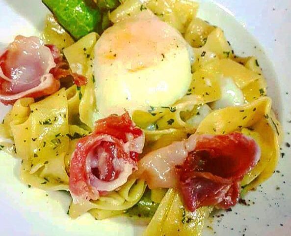 A Chef Camila elaborou um prato de macarrão pappardelle artesanal de fabricação própria ao molho de vinho branco, ervas e limão siciliano, ovo perfeito, feito em termocirculador na temperatura ideal, deixando a gema com muita cremosidade, folhas fritas de couve e fatias do Parma artesanal finamente cortadas e servidas em sua forma natural para não perder suas propriedades.