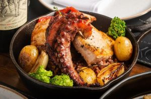Já o segundo prato, uma releitura de um clássico da OX Room Steakhouse, o chef Vini junta os sabores do bacalhau confitado no azeite e do polvo em um mesmo preparo, também assados na parrilla e acompanhados de batatas, cebolas, pimentão e brócolis acompanhados de arroz vermelho da casa. “É um prato bem saboroso com várias texturas”, completa.