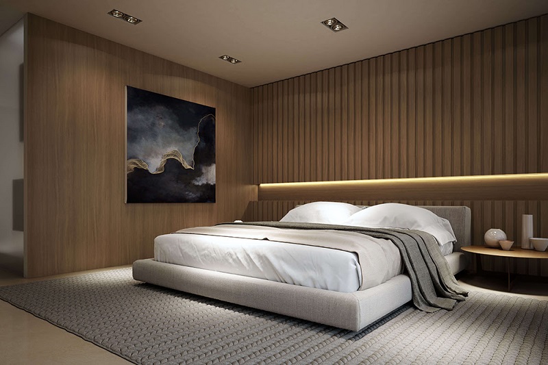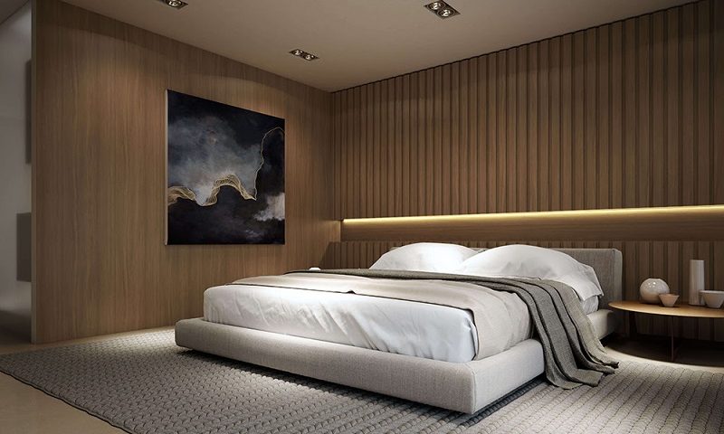 Painel ripado com recorte e iluminação embutida reveste a parede e se torna a cabeceira da cama, tornando o espaço amplo e sofisticado. Amadeirado Forest, lançamento Coleção Youniverse.
