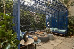 Também no pavimento térreo da mostra está o Jardim dos Anjos, um espaço cercado por um vasto jardim vertical pontuado por palmeiras tropicais que recebe um gazebo em clima contemplativo, feito em aço corten inteiramente pintado na cor azul. Um dos destaques do ambiente, além das esculturas de anjos iluminadas e suspensas, são as bicas de água que saem das folhagens e para a cadeira de balanço italiana instalada estrategicamente.