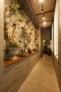 O paisagismo também marca presença em outros espaços da mostra, como o Home Cinema, assinado pela arquiteta Estela Netto, em uma palmeira gigante, no Restaurante Na Mesa da Agnes, com projeto de Beth Nejm, que conta com uma vistosa pata de elefante dentro de uma redoma. No segundo pavimento, dois ambientes utilizam de jardins suspensos de maneiras pouco convencionais. O Living, assinado pelo jovem arquiteto Pedro Felix, preenche verticalmente uma das paredes do espaço, enquanto o Corporativo, projetado por Junior Piacese, trabalha um jardim suspenso horizontal para trazer conforto e uma atmosfera de relaxamento para um espaço comumente atribuído a encontros e finalidades profissionais.