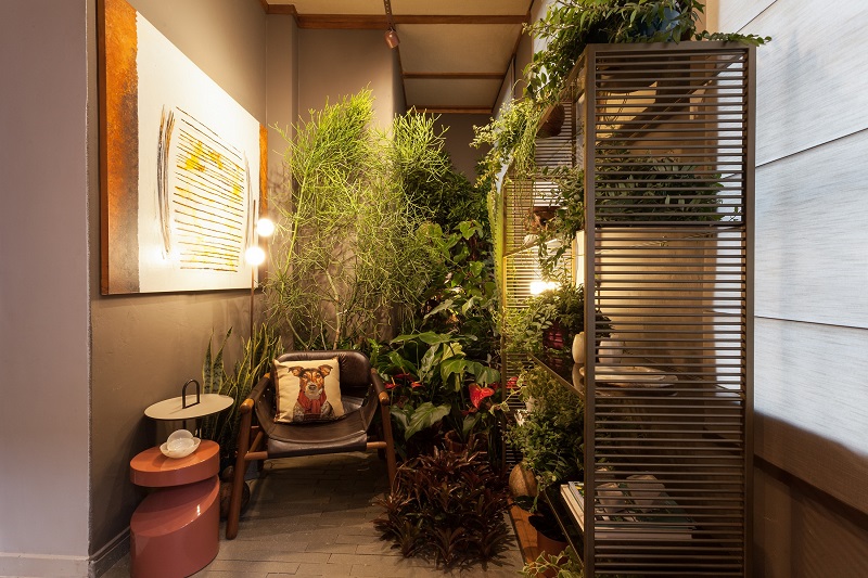 Localizado no primeiro pavimento do casarão, o projeto da Sala do Botânico, assinado por Ana Paula Fonte Boa, foi pensado para deixar qualquer apaixonado pela natureza em êxtase. Para isso, a paisagista criou uma espécie de urban jungle que apresenta vegetação pujante, comungada até mesmo nas paredes do ambiente. Uma delas, inclusive, foi estampada com desenhos botânicos feitos à mão, criando um caminho com mix de caminhos e terrários.