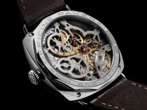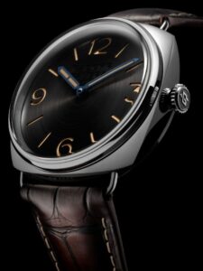 O charme vintage do modelo se completa com o mostrador Radiomir luminescente, recurso que se tornou símbolo da marca e representa os primeiros protótipos de relógios que a Panerai produziu para os mergulhadores militares italianos. A pulseira é confeccionada em couro de crocodilo marrom – escuro com uma fivela trapezoidal em ouro branco polido. O relógio resiste a mergulhos de até 100 metros de profundidade.