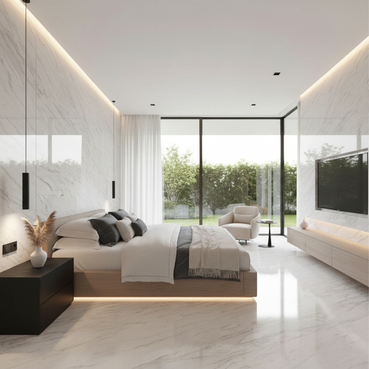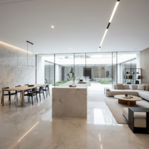 Outros materiais também reforçam essa tendência, como o Quartzito White Lux, que combina resistência e elegância; o Mármore Importado Branco Pighes, de aparência delicada e homogênea; e a Lâmina Infinity Calacatta Glory, que traduz modernidade e impacto visual por meio de veios marcados sobre uma base clara e luminosa.
