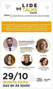 Prevenção ao câncer de mama é o tema do mês de outubro, mas o assunto vai além dos trinta e um dias. O exame de câncer de mama é essencial para prevenir a doença que acomete mulheres e até 1% dos homens do mundo inteiro. Quanto mais precoce o diagnóstico, maiores são as chances de cura. Para falar sobre prevenção, acolhimento e resgate aos direitos de pacientes com câncer de mama, o LIDE Mulher Paraná fará uma super live na próxima quinta-feira, 29, às 9h00. O evento tem como objetivo abordar como o câncer de mama impacta não só os pacientes, mas a sociedade como um todo. Para debater o assunto, a live conta com a presença de Dr Bruno Azevedo, presidente da Sociedade Brasileira de Cirurgia Oncológica (SBCO); a ex-governadora e autora da lei que instituiu o dia da luta contra o câncer de mama no Paraná, Cida Borghetti; a advogada, Dra Mariana Domingues; a médica radiologista, Dra Maria Helena Louveira; e com mediação da membro do Comitê do LIDE Mulher Paraná, Evilym Machado.