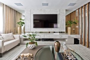 Beleza e estilo caminham de mãos dadas nesse projeto assinado pela arquiteta Caroline Andrusko. O painel de mármore garante mais elegância ao ambiente, enquanto as caixas de som embutidas no teto conferem maior discrição na instalação dos equipamentos de áudio.