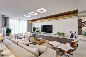 Nesse espaço projetado pelo escritório Machado, Weiss e Moraes Arquitetura e Interiores, a escolha de nuances neutras trouxe um ar bastante aconchegante à sala de TV. O grande destaque do ambiente fica por conta da poltrona Lounge Eames, que além de confortável, é uma obra de arte que carrega parte da história do design do século XX.