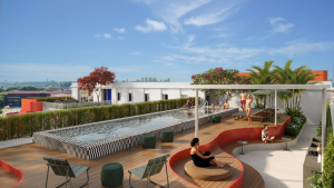A cobertura ou rooftop terá piscina ao ar livre, Espaço Gourmet e salão de festas com churrasqueira. O subsolo, de uso restrito aos moradores, será setorizado em três áreas: estudos, jogos digitais e alimentação. “O primeiro conta com cabines para estudos individuais e em grupos, o segundo dispõe de projetor com sistema de som de cinema, mobiliário modular e componível e o terceiro oferece opções para uma alimentação rápida e cafés, além de cozinhas completas integradas com um jardim central e o cinema ao ar livre”, detalha a arquiteta Thatiane Barros, diretora executiva da incubadora.