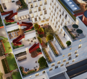 Com projeto de interiores que leva a assinatura do Atelier 1901 – incubadora de novos arquitetos e urbanistas – e da Pitá Arquitetura, o B41 terá áreas comuns em diferentes pavimentos. “Com o objetivo de capacitar arquitetos e potencializar talentos, o Atelier 1901 envolveu oito arquitetas no desenvolvimento dos projetos, durante 10 semanas de imersão. Foram propostas intervenções na arquitetura, como um rasgo na laje da praça e a adição de novos usos dentro do bicicletário: churrasqueira, arquibancada com coolers, além de mesas e cadeiras para confraternizações”, conta o arquiteto Ismael Zanardini, mentor e cofundador do Atelier 1901.