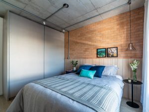 No dormitório, seu uso pode, em um primeiro momento, parecer um tanto quanto ousado. Porém, em contexto bem equilibrado com a paleta de cores e os materiais, o brick evoca autenticidade na parede da cabeceira. E com o advento do home office, as características do tijolinho permitem uma ambiência séria, arrumada e perfeita para as horas do expediente e das reuniões online.
