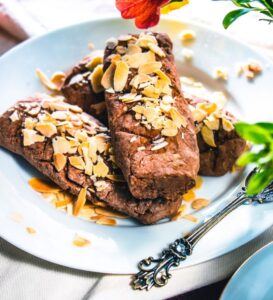 6. Enquanto ainda estiverem quentes, pincele com xarope ou mel e pressione as amêndoas picadas.