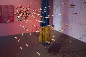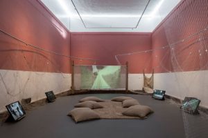 Ziel Karapotó, por fim, confronta processos coloniais em Cardume 2, uma instalação que une, com uma rede de tarrafa, maracás de cabaça e réplicas de projéteis balísticos, envolvidos por uma paisagem sonora com sons de rios e torés (cantos tradicionais do povo Karapotó) que se misturam a sons de disparos de armas de fogo. Cardume 2 evoca a luta pelos territórios frente aos processos de genocídio que se atualizam nos últimos 524 anos, mas sobretudo reforça a resistência indígena por meio da vida: os torés afirmam a espiritualidade; a rede de pesca representa as correntezas dos rios, mares e a fartura de peixes; e, finalmente, o maracá conecta os povos indígenas à terra onde vivem.