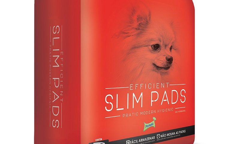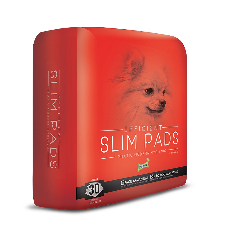 O Slim Pads, é o novo tapete higiênico da marca, tem tamanho de 80 cm x 60 cm, manta absorvente de 70 cm x 50 cm. São sete camadas de proteção que absorvem até 2,0 litros e permite que o pet utilize em média de cinco vezes.