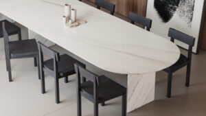 Já o segundo modelo se inspira em um metal amplamente utilizado ao longo da história da civilização. Partindo do bronze, Marina e sua equipe chegaram ao latão, cuja elegância dourada se traduz nas lâminas de Petra Bronze, com acabamento que simula uma chapa escovada, nuances douradas e relevo sutil. Unindo a reverência ao passado com um olhar voltado para o futuro, Marina Linhares criou, junto à Portinari, uma coleção de produtos que transcende o visual, propondo espaços capazes de contar histórias enquanto celebram estética e funcionalidade.