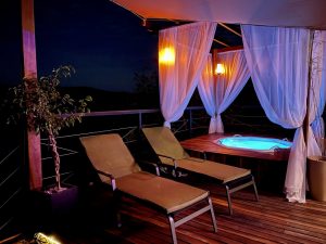 Junto à tenda, uma área descoberta oferecerá rede horizontal suspensa e uma banheira de hidromassagem com cromoterapia com vista para a Serra. “Neste último caso, a hidro contará com quatro cores (amarelo, verde, vermelho e azul) com o objetivo de mudar as vibrações do corpo na frequência da saúde, do bem-estar e da energia”, detalha Jacob.
