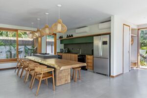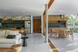 As cores foram escolhidas para criar um ambiente atemporal e acolhedor, com tons neutros como o cinza do concreto, a madeira natural, o branco e o verde da fachada. No térreo, a área social é ampla e integrada, com espaços generosos e aberturas que permitem ventilação e iluminação naturais. “Queríamos que os ambientes se conectassem de maneira fluida, criando uma experiência de total interação entre os moradores e o exterior”, explica Luíza Querido.