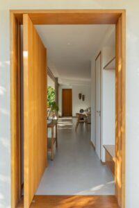 A estrutura da casa é predominantemente em concreto aparente, o que garante durabilidade e um visual moderno, enquanto os caixilhos de madeira reforçam a sensação de acolhimento. “O uso desses materiais foi pensado para que houvesse uma continuidade com o ambiente externo, como se a casa fosse uma extensão do próprio jardim”, completa Rodrigo Alves Pereira. O telhado segue uma proposta funcional e leve, com estrutura de madeira e telhas cerâmicas, além de beirais que protegem os ambientes internos do sol e da chuva, permitindo uma ventilação cruzada eficiente.
