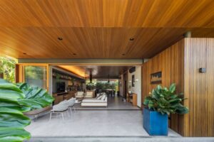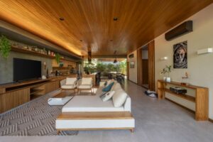 O projeto visa criar um ambiente amplo e fresco, proporcionando conforto mesmo nos dias mais quentes da região. “Nosso objetivo foi criar uma casa que se integrasse com o clima quente da região litorânea, utilizando materiais naturais como madeira e vidro, que não apenas oferecem sofisticação, mas também uma sensação de acolhimento e conexão com o entorno natural”, explicam os arquitetos Thiago Brunini Pitta e Rodrigo Alves Pereira. O projeto visa criar um ambiente amplo e fresco, proporcionando conforto mesmo nos dias mais quentes da região.