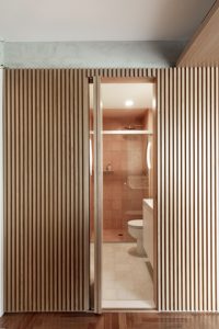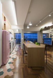 O destaque da cozinha fica por conta da geladeira colorida. Já na sala, é a vez da poltrona e a cama Murphy, bem como a TV que se torna uma obra de arte!. No banheiro social, o fato dele ser envolto por um ripado de madeira. No terraço a mesa que solta do balcão e se move! Nos banheiros o uso intenso de ladrilhos e cerâmicas, o ripado de madeira com cabeceira de tecido no quarto, e closet com um grande espelho iluminado de maquiagem!