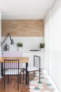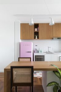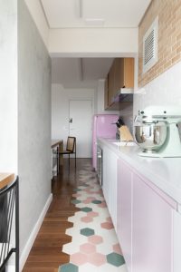 As cores e materiais predominantes são: o rosa da geladeira, madeira, e um verde escuro! Texturas, madeiras e o ladrilho hidráulico são os astros! Já o conceito do projeto consiste em espaços aconchegantes, pouco minimalista, que conta histórias da cliente, onde cada elemento tem a sua própria!
