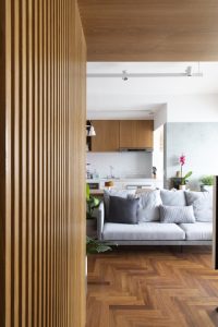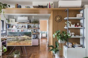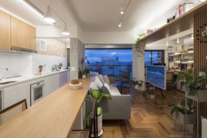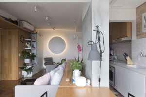 O apartamento originalmente contava com 3 dormitórios, 2 quartos. Além de uma cozinha compartimentada por balcão. “Alteramos os espaços de modo a transformar o quarto master em suíte master, com seu dormitório adjacente em closet. E abrimos um outro para a sala, transformando em escritório. Adequamos a planta com a remoção dos caixilhos e integrando o terraço para a sala e cozinha”, comenta Kanô.