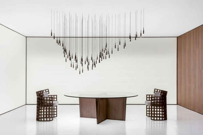O jogo de transições entre planos verticais e horizontais forma uma trama orgânica que permite à luz atravessar a peça, revelando diferentes perspectivas conforme o ponto de vista. A estrutura, composta por pequenos elementos justapostos, remete a uma malha arquitetônica ao mesmo tempo precisa e fluida, na qual rigor geométrico e expressão poética coexistem.