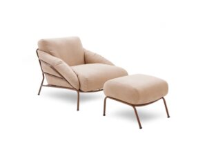 Outra peça de destaque é a poltrona C220, do Estúdio Ninho, que revisita a clássica poltrona de clube com traços mais leves e linguagem contemporânea. O estofamento generoso e a base robusta garantem conforto e versatilidade, fazendo dela uma escolha certeira para lounges e áreas de convivência.