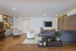Com circulação repensada, divisões eliminadas, nova marcenaria, customizada sob medida para o dia a dia família, madeira em vários locais, como painéis, piso e mobiliário, Roberta e sua equipe conquistaram lugares fluídos, práticos, integrados e, sobretudo, acolhedores, com o toque de modernidade que tanto os moradores sentiam falta. Coube a iluminação minuciosa valorizar texturas, objetos e obras de arte, demarcar áreas ajudar a compor o clima de aconchego.